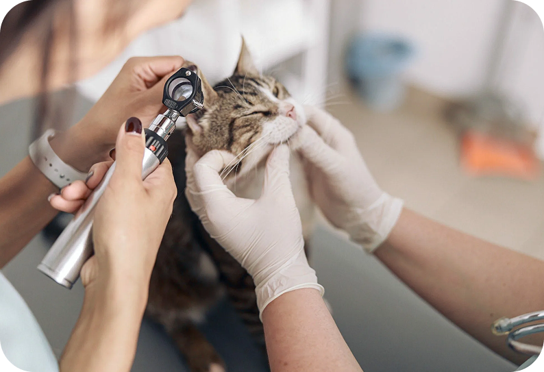 - Перед исследованием ветеринар осматривает ушную раковину, пальпирует основание уха.